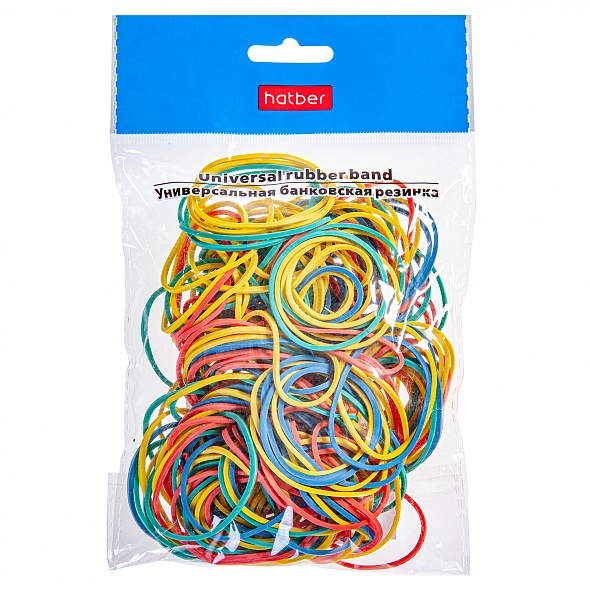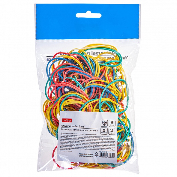 Банковская резинка имеет длину 60мм, диаметр 38мм. Толщина и ширина резинки - 1,6мм. Доля натурального каучука составляет 60%.Резинка не рвется, хорошо растягивается и легко сжимается, плотно стягивая купюры и упаковки. Фасуется в пакеты с европодвесом 100г. В пакете - 4 цвета ассорти: красный, желтый, голубой и зеленый.