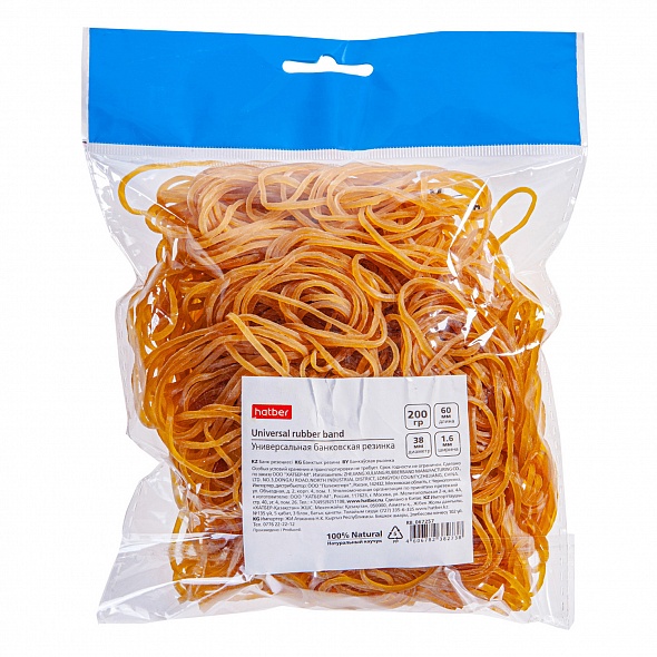Банковская резинка из 100% натурального каучука. Резинка имеет длину 60мм и диаметр 38 мм. Толщина и ширина резинки - 1,6 мм. Обладает наивысшим коэффициентом растяжения, устойчива к разрывам и имеет более длительный срок службы. Фасуется в пакеты с европодвесом по 200 г. Незаменимый канцелярский предмет, необходимый для использования в офисном помещении, банковском учреждении и в быту.