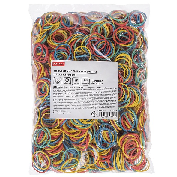 Резинка банковская цветная от Hatber — удобный и практичный канцелярский товар. Диаметр — 25 мм, длина — 40 мм. В упаковке 500 г резинок в пакете.