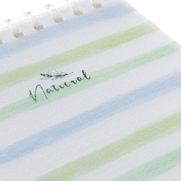 Пластиковая обложка с печатью, текстурой и тиснением фольгой придаёт блокноту премиальный вид. Мягкая спираль обеспечивает удобство использования и сохранность листов.