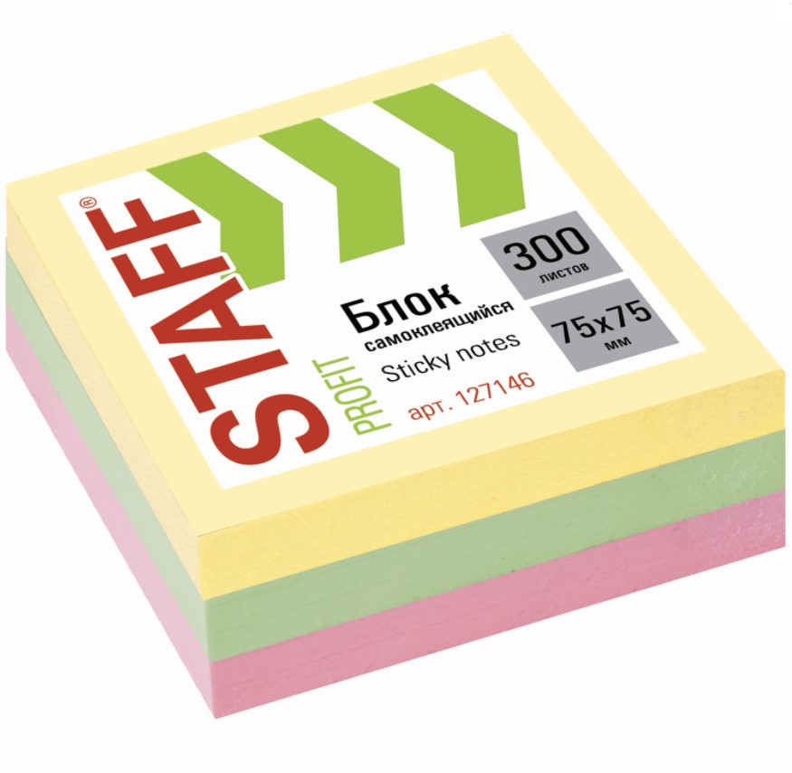 3 пастельных цветов (жёлтый, зелёный, розовый) в форме куба 75х75 мм состоят из 300 листов. Плотность бумаги составляет - 75 г/m2. Клейкий слой - 22 Н/м. Легко клеятся к любой поверхности. Не оставляют следов. Упаковка - полиэтиленовая плёнка.