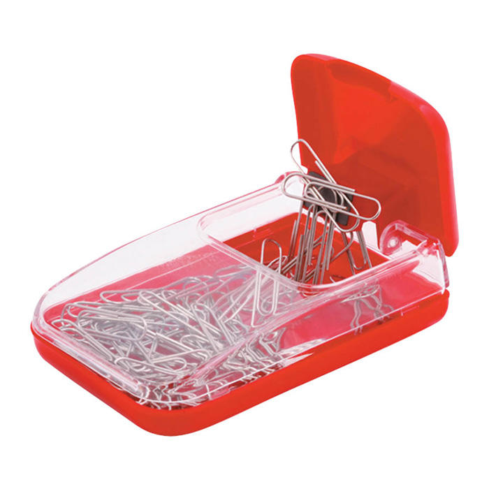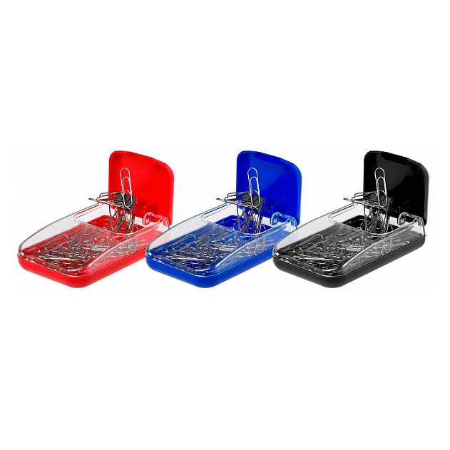 Удобный магнитный диспенсер для скрепок с крышкой, прозрачный пластиковый корпус. Цветовая гамма - синий, красный, черный. Поставляется без скрепок. Индивидуальная упаковка в картонную коробочку.