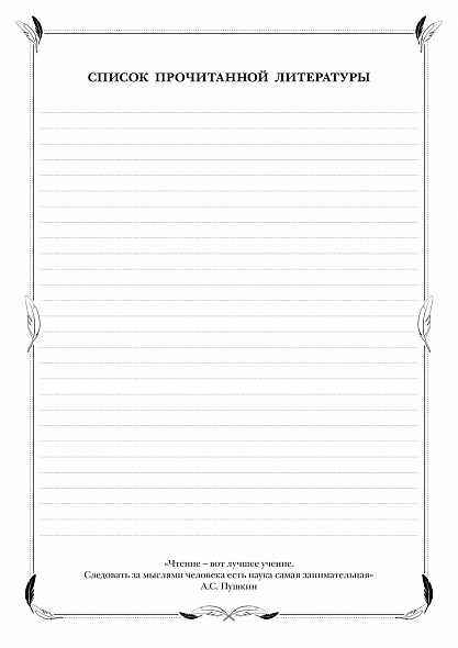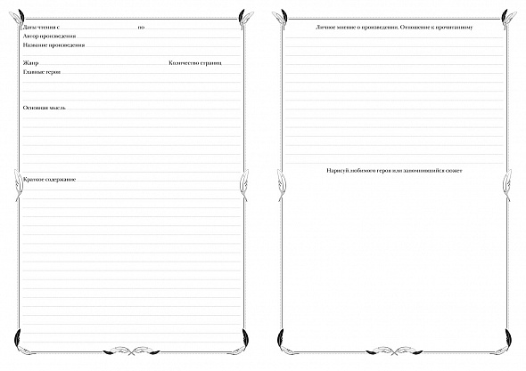 Читательский дневник А4 формата предназначен для работы с произведениями для внеклассного чтения. Школьник оценивает сюжетную линию, составляет анализ и записывает в дневник выводы от прочитанного. Помимо стандартных полей, в которых необходимо заполнить дату чтения, краткое содержание, жанр и т.п, имеется поле для рисунка, что делает заполнение дневника более творческим и интересным. Обложка: мелованный картон. Внутренний блок: офсет 65 гр., 24 листов, на скобе. Линовка - оригинальный блок