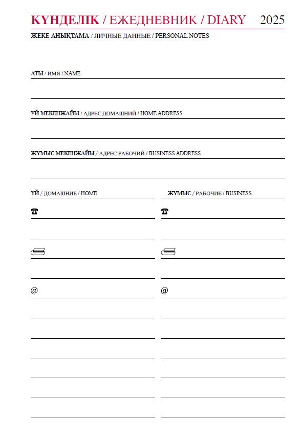 Ежедневник датированный на 2025 год. Адаптирован для Казахстана. Подходит для блинтового тиснения и тиснения фольгой. Обложка изготовлена из высококачественного материала "Sarif" (итальянский заменитель кожи), имитирующего естественную фактуру кожи с мягким благородным блеском. Обложка твердая, продублирована поролоном, по краю отстрочка, скругленные уголки. В ежедневнике прошитый переплет, имеются каптал и ляссе. Блок с перфорированными уголками содержит телефонную книгу и обширный справочный материал. На форзаце и нахзаце изображены карт Казахстана и Европы. Ежедневник представлен на трёх языках (казахском, русском, английском). Ежедневник ТМ "Hatber" станет не только отличным помощником в оптимизации графика встреч и планировании рабочего времени, но и стильным аксессуаром, позволяющим подчеркнуть индивидуальность владельца.