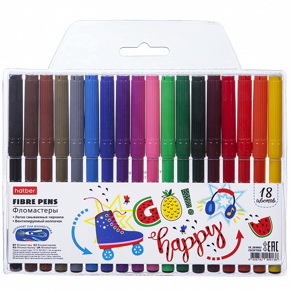 Фломастеры для рисования на бумаге и раскрашивания, подходят для детей младшего и школьного возраста. Набор фломастеров содержит 18 ярких насыщенных цветов. Чернила нетоксичны и безопасны для детей, легкосмываемые с рук и одежды. Специальная форма пишущего узла предотвращает его проваливание внутрь корпуса при сильном нажатии. Увеличенный размер пишущего узла: 2,3 мм. Увеличенная длина письма: 600м. Дополнительные грани на колпачке предотвращают случайное скатывание фломастера со стола. Данные фломастеры подходят для фломографа HATBER. Фломастеры упакованы в блистер с европодвесом.