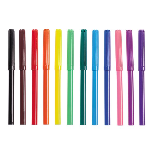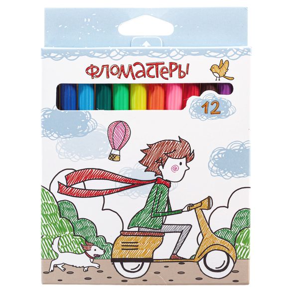В наборе 12 фломастеров для рисования на бумаге. Корпус изготовлен из полипропилена, имеет вентилируемый колпачок. Легко смываемые чернила не токсичны и безопасны для детей. На белый корпус фломастеров нанесен оригинальный контрастный рисунок, который привлекает дополнительное внимание к продукции. Срок годности: 3 года. Длина линии: не менее 500 метров. Фломастеры упакованы в лакированную картонную коробку с петлей-европодвесом.