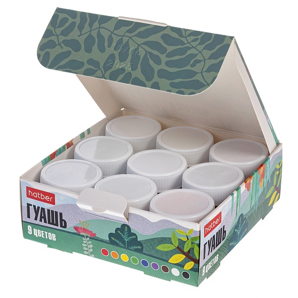 Гуашь предназначена для рисования на бумаге, картоне, дереве, холсте. Гуашь легко разбавляется водой, а плотный матовый слой быстро сохнет. Яркие насыщенные цвета и оптимально подобранная гамма прекрасно подходит для детского творчества. Набор содержит 9 цветов в баночках емкостью 20 мл. Благодаря плотно закрывающимся крышкам гуашь долго сохраняет свои свойства. Упаковка: картонная коробка с фиксирующим клапаном.