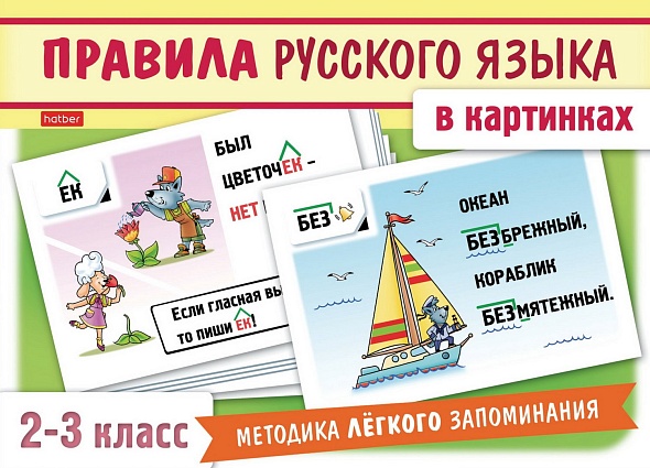 Наглядное пособие 'Правила русского языка в картинках' предназначены для учеников 2-3 класса. В комплект входят 24 карточки: 17 карточек с правилами, 6 карточек с играми и 1 карточка с рекомендациями для взрослых. Каждая карточка имеет оборот с дополнительными заданиями. Формат: 120х170 мм. Материал: картон, цветной. Упаковка: картонная коробка.