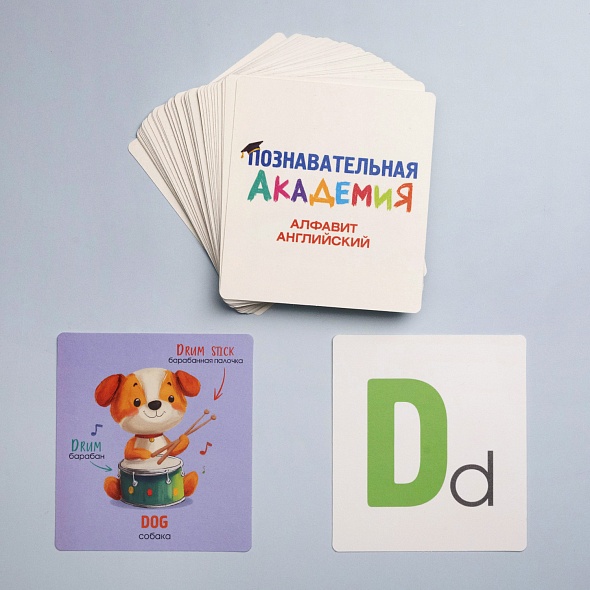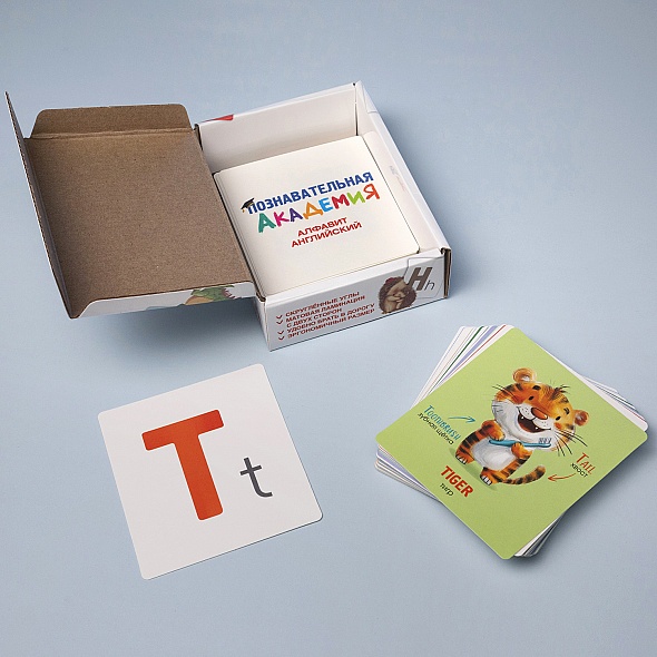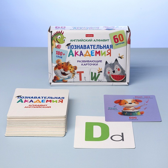 Развивающие карточки «Познавательная академия» изготовлены из мелованного картона с покрытием софт-тач - тактильно приятные и устойчивые к износу. Скругленные углы обеспечивают безопасность даже для самых маленьких детей. Компактная глянцевая коробка для хранения - яркая и прочная, позволяет брать набор с собой в дорогу, делает набор удобным для хранения и отличным вариантом для подарка.· Набор содержит 60 карточек.· Размер карточки 90х100мм. · Размер коробки 100х140х30мм.Набор станет отличным помощником для родителей и педагогов, желающих сделать обучение интересным, наглядным и эффективным! «Познавательная академия» - это эффективный инструмент для освоения базовых понятий и раннего развития.«Английский алфавит» - это красочные карточки с буквами и словами на английском языке, переводом и иллюстрациями. В наборе более 180 слов и базовых слов, что делает обучение легким и интересным.