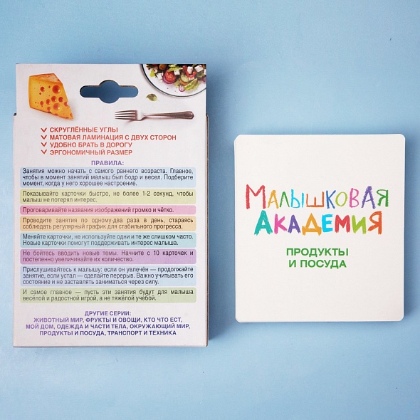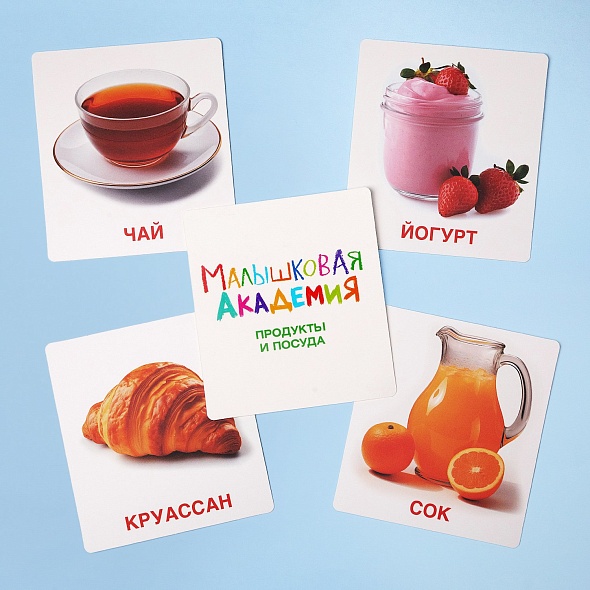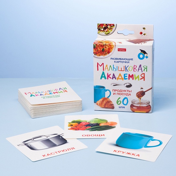 Наглядное пособие «Малышковая Академия» представляет собой комплект из 60 развивающих карточек, посвящённых продуктам и посуде. Карточки упакованы в картонную коробку с европодвесом.