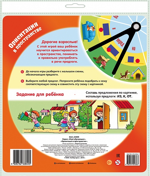 Уникальные развивающие круги на основе 'кругов Луллия' созданы по технологии ТРИЗ (Теория решения изобретательских задач, автор Г. Альтшуллер - изобретатель-патентовед, этот метод более 20 лет используется также в детской дошкольной и школьной педагогике, он позволяет развивать гибкость мышления, системность и поисковую активность, стремление к новизне, речь и творческое воображение). Изделие состоит из листа картона + 2 круга из картона (диаметром 150 и 100 мм) + стрелка из пластика (в виде буквы 'V'). Круги и стрелка крепятся к основе клепкой. С этой игрой ребёнок научится ориентироваться в пространстве, понимать и правильно употреблять в речи предлоги. На обратной стороне изделий даны рекомендации и задания для проведения занятий. Формат: 220х240 мм. Упаковка: индивидуальная в пакет с европодвесом.