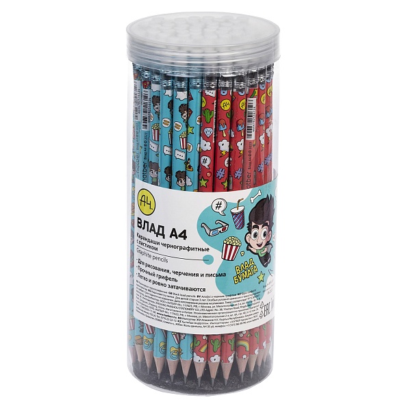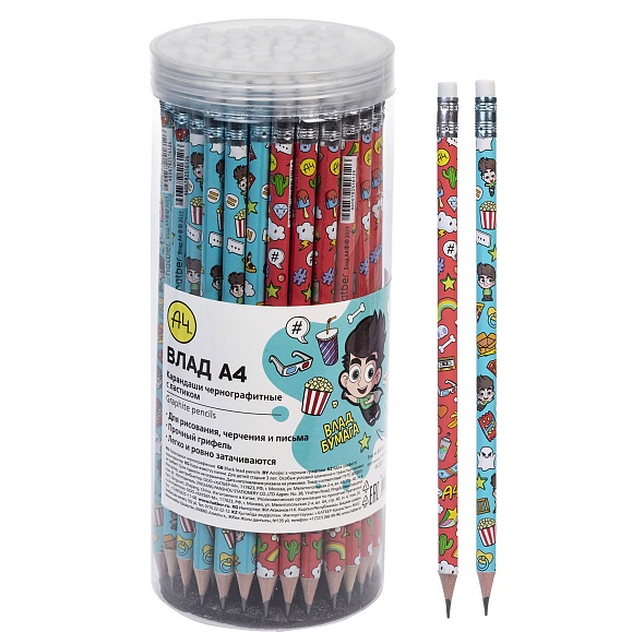 Чернографитный карандаш для черчения, рисования и письма. Круглый корпус. Хорошо и ровно точится. Прочный грифель диаметром 2 мм и твердостью HB. С ластиком. Заводская заточка. Упаковка: пластиковая туба по 72 штуки.