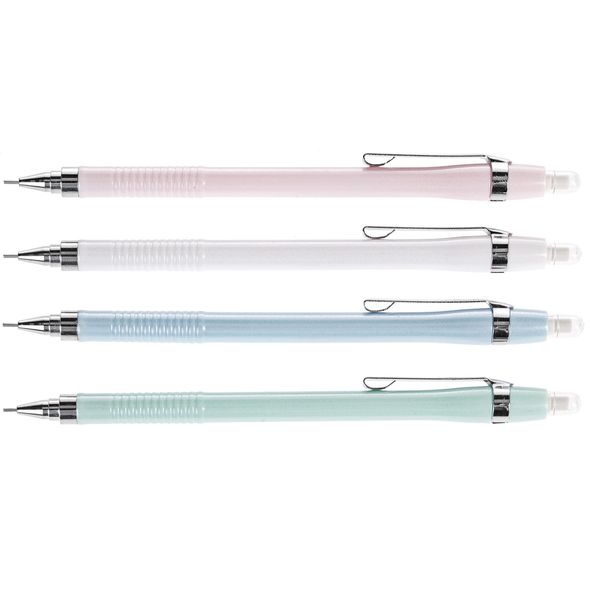 Механический карандаш с металлическим клипом и встроенным ластиком. Легкие перламутровые цвета корпусов. Рифленная зона для пальцев. Диаметр грифеля: 0,5 мм. Твердость: НВ. В комплекте 2 запасных грифеля.