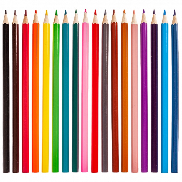 В наборе 18 шестигранных цветных карандашей с заточенным грифелем. Корпус изготовлен из высококачественной древесины, гладкость которой обеспечена многослойной покраской. Их удобно держать в руках, они легко затачиваются, имеют прочный грифель. Яркие насыщенные цвета оставляют мягкие штрихи и ровно ложатся на бумагу. Карандаши помогут юным художникам развить мелкую моторику рук, цветовое восприятие, фантазию и воображение. Упакованы в картонную лакированную коробку с петлей-европодвесом.