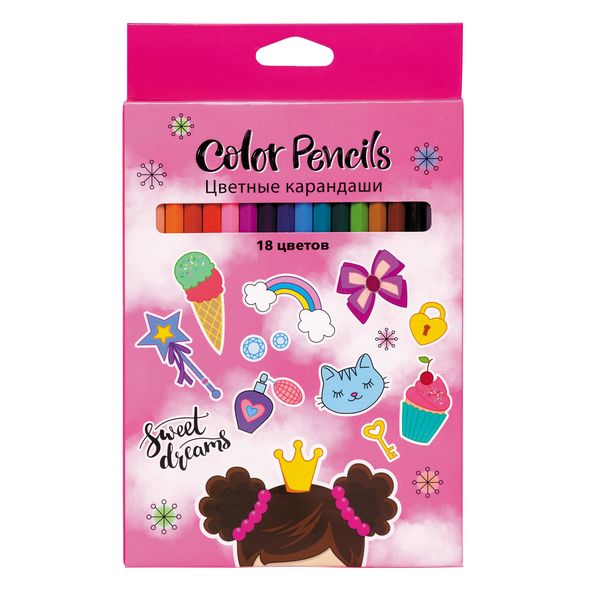 В наборе 18 шестигранных цветных карандашей с заточенным грифелем. Корпус изготовлен из высококачественной древесины, гладкость которой обеспечена многослойной покраской. Их удобно держать в руках, они легко затачиваются, имеют прочный грифель. Яркие насыщенные цвета оставляют мягкие штрихи и ровно ложатся на бумагу. Карандаши помогут юным художникам развить мелкую моторику рук, цветовое восприятие, фантазию и воображение. Упакованы в картонную лакированную коробку с петлей-европодвесом.