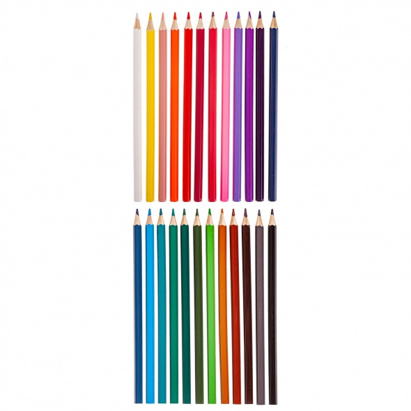 В наборе 24 шестигранных цветных карандаша с заточенным грифелем. Корпус изготовлен из высококачественной древесины, гладкость которой обеспечена многослойной покраской. Их удобно держать в руках, они легко затачиваются, имеют прочный грифель. Яркие насыщенные цвета оставляют мягкие штрихи и ровно ложатся на бумагу. Карандаши помогут юным художникам развить мелкую моторику рук, цветовое восприятие, фантазию и воображение. Упакованы в картонную лакированную коробку с петлей-европодвесом.