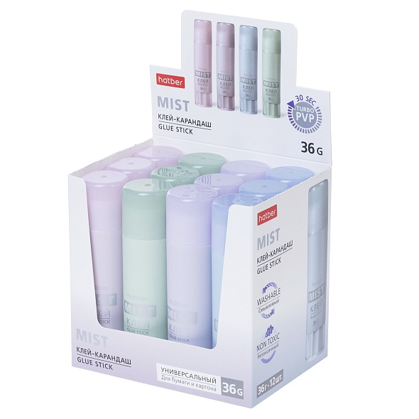 Клей-карандаш надёжно склеивает изделия из бумаги, картона и ткани. Новая формула на PVP основе склеивает бумагу за 30 сек, не деформируя ее и не оставляя следов после высыхания. Он экономичен в использовании, не токсичен и смываемый. Надежный колпачок предохраняет клей от высыхания. Клей-карандаш легко скользит и гладко наносится на склеиваемую поверхность, выдерживает низкие температуры. Пригоден для использования на работе, дома и в школе. Объем: 36 гр. Упаковка: 12 шт. в картонной дисплей-витрине.