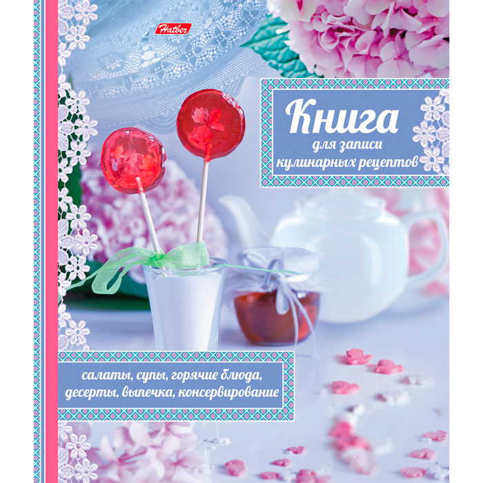 80-листные книги для записи кулинарных рецептов на четырех кольцах отличатся аппетитными дизайнами обложек. Изделия имеют внутренний блок с пятью цветными разделителями, на лицевой стороне которых указано название того или иного раздела – салаты и закуски, супы, горячие блюда, десерты и консервирование, а также изображено вкусное блюдо с рецептом его приготовления. На оборотной стороне вкладышей можно найти полезную информацию о мере и массе продуктов, секреты кулинарии и полезные советы,  основные правила сервировки стола и этикета приема пищи.