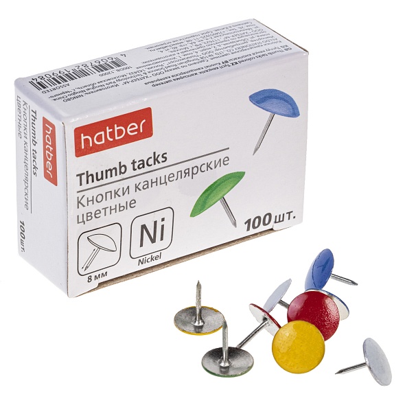 Кнопки-гвоздики никелированные с цветными головками для надежного крепления бумаги. Диаметр -10 мм, длина острия - 7 мм. Упаковка в картонную коробочку - по 100 шт.