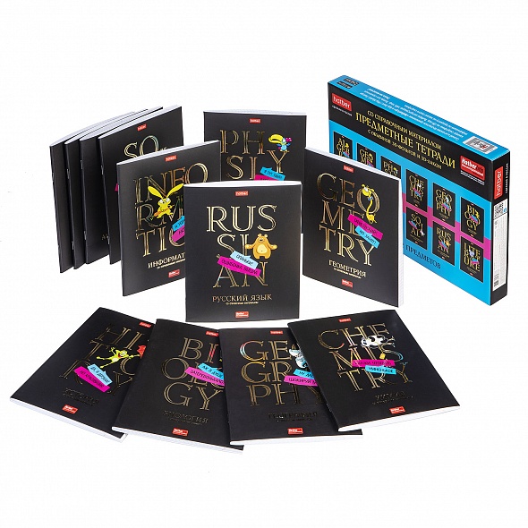 Комплект включает в себя тетради по самым востребованным школьным предметам: алгебре, геометрии, физике, химия, географии, биологии, истории, английскому языку, информатике, обществознанию, русскому языку и литературе. Используется в старших классах. Справочная информация в каждой предметной тетради является мини-пособием при подготовке к проверочным работам и экзаменам. Тетрадь поддерживает приложение с интерактивной справочной информацией HatberHelp. Достаточно скачать бесплатное приложение в App Store или Google Play, навести камеру смартфона на QR-код на обложке и выбрать интересующую тему из школьной программы. Приложение работает без доступа в интернет. Обложка тетрадей из мелованного картона, дополнена спецэффектами в виде матовой ламинации, 3D фольги и 3D лака. Внутренний блок: офсет 65 гр. Линовка: клетка и линия (русский язык, литература), красные поля. Упаковка в подарочную коробку.