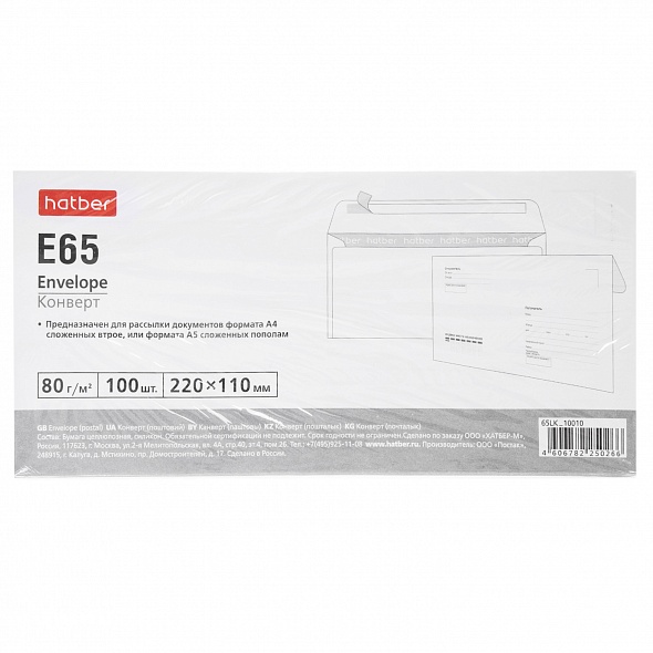 Конверт "Hatber", Е65 выполнен в евроформате размером 110 х 220 мм без окна, с подсказом и с внутренней запечаткой. Предназначен для вложения листов формата А4, сложенных втрое или А5, сложенных вдвое. Клапан конверта крепится с помощью отрывной силиконовой ленты. Конверты поставляются в пленке по 100 штук.