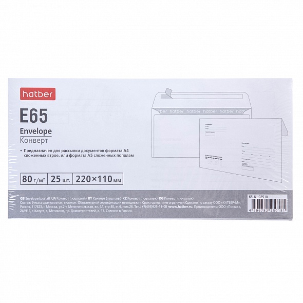 Конверты Hatber Е65 с почтовым подсказом 'Куда-Кому' без окна изготовлены из высококачественной бумаги высокой степени белизны плотностью 80 гр. Дополнены клеевым нанесением в виде отрывной силиконовой ленты. Имеется внутренняя запечатка серого цвета, которая предотвращает нежелательный просмотр содержимого. Размер конверта: 110х220 мм. Упаковка: 25 шт. в термоусадочной пленке с информационным вкладышем.