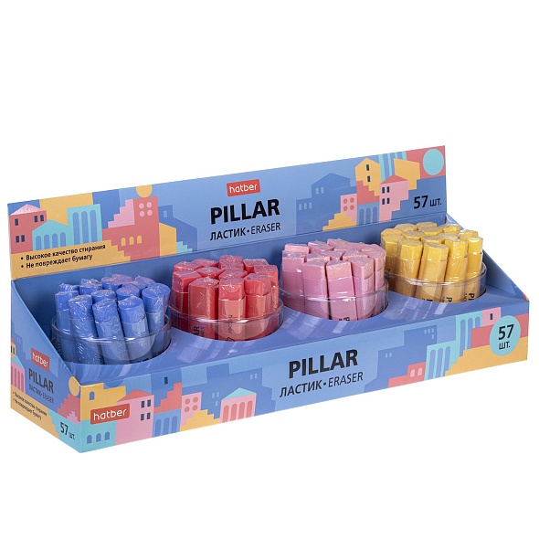 Ластик идеально подходит для применения как в школе, так и в офисе. Изготовлен из материала TPR (термопластичная резина), при стирании оставляет минимальное количество мусора благодаря технологии 'DUST FREE' (без пыли). Не повреждает бумагу. Возможно использование для бумаги различной плотности. В отличие от натурального каучука не требует особых условий хранения. Долгий срок службы.Ластик TPR Hatber Pillar 57 шт в картонной Дисплей-витрине.