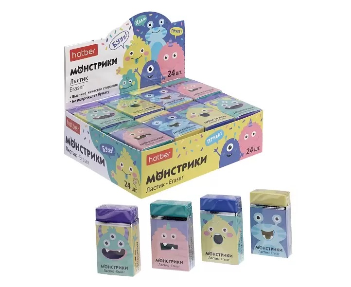 Ластик идеально подходит для применения в школе и не только. Оригинальный дизайн с яркими мордочками монстриков понравится детям и взрослым. Изготовлен из материала PVC, максимально бережно относится к самой тонкой бумаге и позволяет стирать с одного места несколько раз. Долгий срок службы.