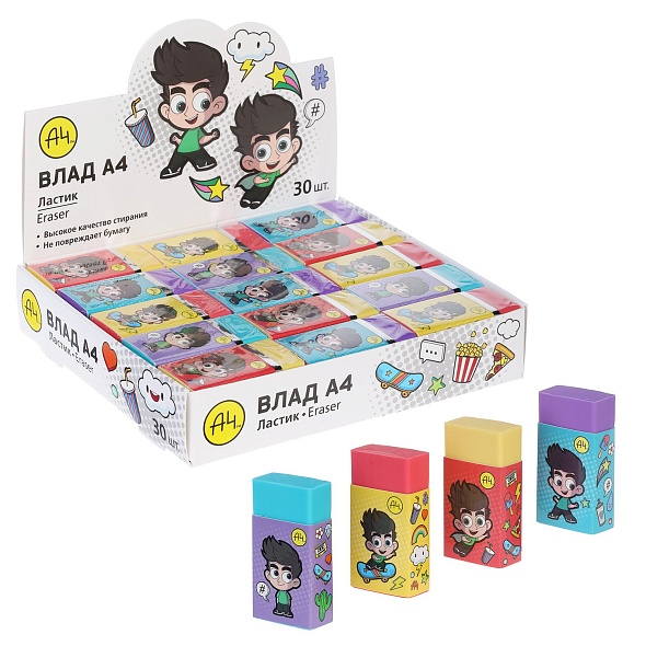 Ластик идеально подходит для применения как в школе, так и в офисе. Ластик PVC Hatber -Влад А4- 30 шт в картонной Дисплей-витрине