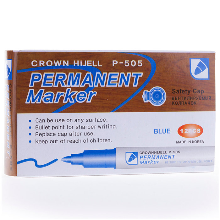Перманентный маркер "Crown" - качество, проверенное временем. Чернила на спиртовой основе. Цвет чернил - синий, диаметр пишущего узла - 2 мм.
