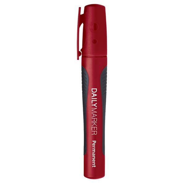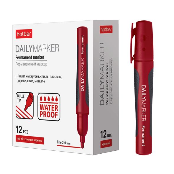 Перманентный маркер подходит для письма на любых поверхностях. Плотный колпачок с клипом предотвращает высыхание чернил, что обеспечивает более длительный срок службы, цвет его соответствует цвету чернил. Пишущий узел: закругленный 2 мм. Цвет чернил: красный. Упаковка: картонная коробка 12 штук.