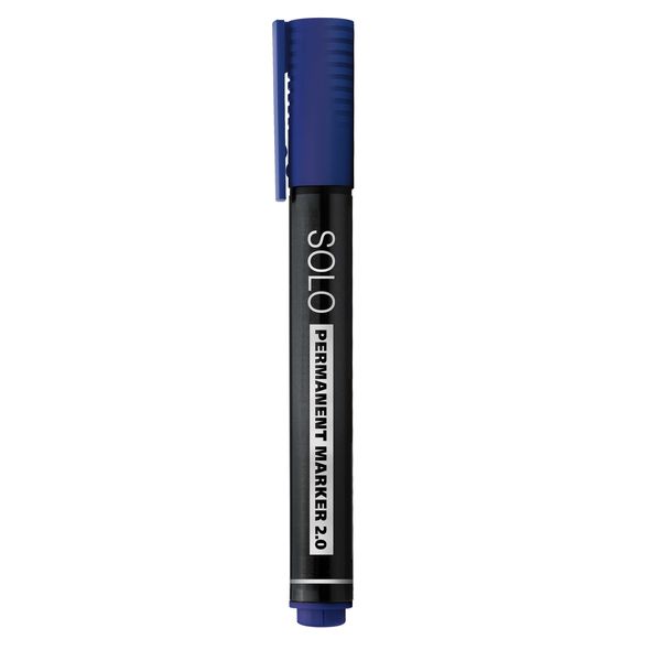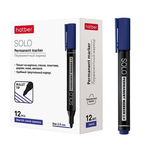 Перманентный маркер подходит для письма на любых поверхностях. Плотный колпачок с клипом предотвращает высыхание чернил, что обеспечивает более длительный срок службы, цвет его соответствует цвету чернил. Пишущий узел: закругленный 2 мм. Цвет чернил: синий.Упаковка: картонная коробка 12 штук.