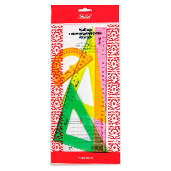 Наборы геометрические, 4 предмета: 2 треугольника, линейка и транспортир. Изготавливаются из пластика, преимуществами которого являются легкость, прочность, разнообразие оттенков, удобная поверхность, не дающая инструменту скользить. Ровная четкая миллиметровая шкала. Идеально подходят как для школы, так и для офиса. Упаковка – индивидуальная, в пакет с европодвесом.
