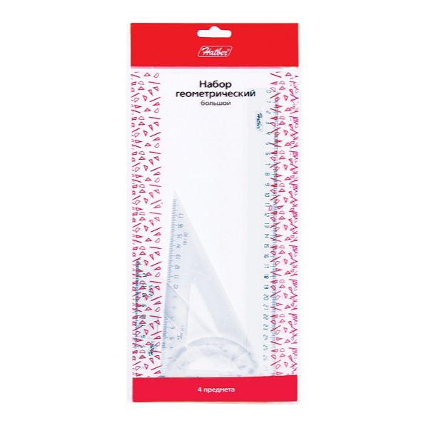 Наборы геометрические, 4 предмета: 2 треугольника, линейка и транспортир. Изготавливаются из пластика, преимуществами которого являются легкость, прочность, разнообразие оттенков, удобная поверхность, не дающая инструменту скользить. Ровная четкая миллиметровая шкала. Идеально подходят как для школы, так и для офиса. Упаковка – индивидуальная, в пакет с европодвесом.