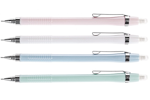 еханический карандаш с металлическим клипом и встроенным ластиком. Легкие перламутровые цвета корпусов. Рифленная зона для пальцев. Диаметр грифеля: 0,5 мм. Твердость: НВ. В комплекте 2 запасных грифеля.