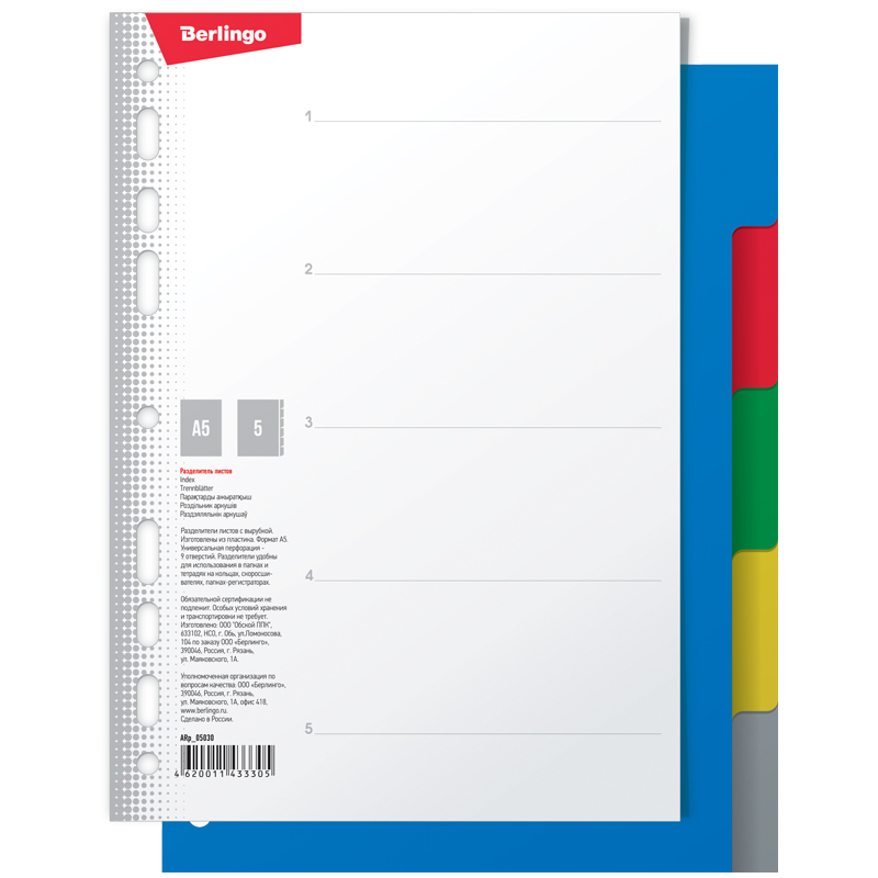 Разделители листов пластиковые, формат А5. Предназначены для систематизации документов внутри папок. Позволяют сортировать содержимое документов по разделам. Удобны в использовании с папками-регистраторами и на кольцах. Индивидуальная упаковка в пленку.