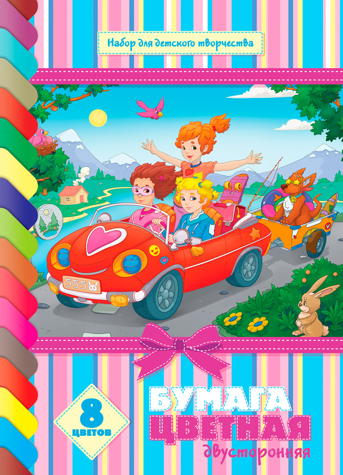 Двухсторонняя цветная бумага идеально подойдет для создания красочных аппликаций, оригами, изготовления открыток и поделок. Может использоваться для скрапбукинга, квиллинга и оформления подарков. В наборе представлены восемь самых востребованных ярких цветов двухсторонней бумаги на восьми листах А4 формата. Обложка: мелованный картон, скрепление: скоба.