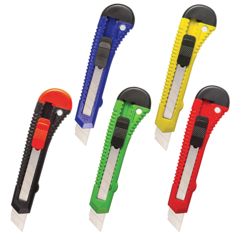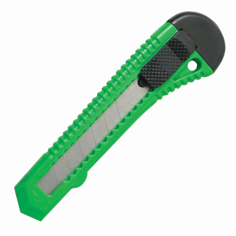 Большой канцелярский нож в удобном пластиковом корпусе с отверстием для повеса. Ширина лезвия - 18 мм. Эргономичный дизайн. Фиксатор лезвия.