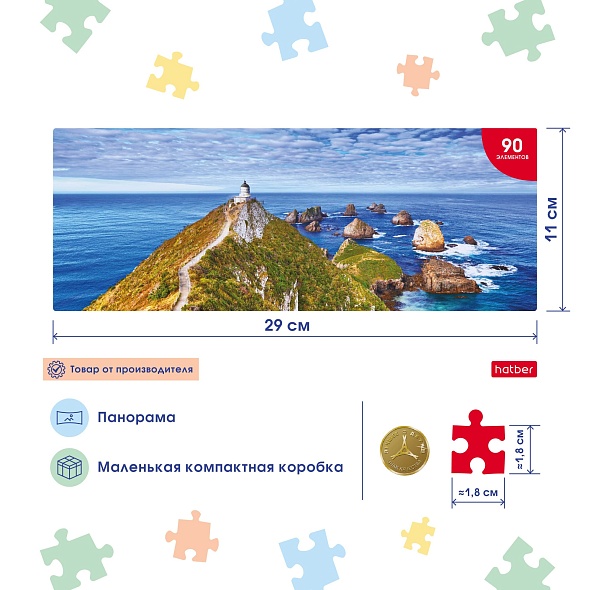 Панорамный пазл состоит из 90 элементов (20х20 мм), дополнительно упакованных в прозрачный пакетик. Неповторимость данного пазла в его вытянутой форме. Яркий красочный дизайн найдет своих почитателей среди детей дошкольного и младшего школьного возраста. Продукция соответствует стандартам качества и награждена Знаком качества 'Лучшее детям' от 'Ростест-Москва'. Упаковка: картонная коробка с клапаном в термоусадочную пленку. Размер коробки: 18х6х4 см. Доверяя Hatber, вы покупаете лучшие товары для детей!
