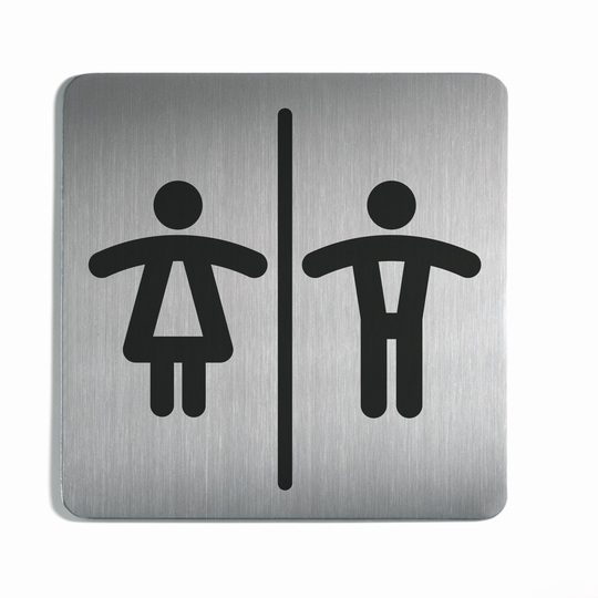 Пиктограмма "WC женский / мужской" из матированной стали. Размер: 150 х 150 мм. Изображение не стирается и не царапается. Крепится при помощи двусторонней клейкой подушечки.