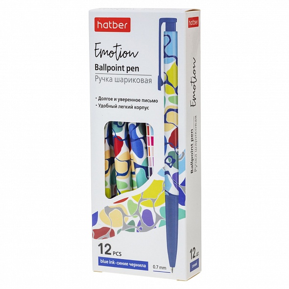 Шариковые автоматические ручки с эмоциональными современными патернами. Хорошая эргономика. Специальный пишущий узел и чернила на масляной основе обеспечивают долгое, легкое и стабильное письмо. Диаметр пишущего узла - 0,7 мм. Цвет чернил: синий. Упаковка - картонная коробка 12 шт.