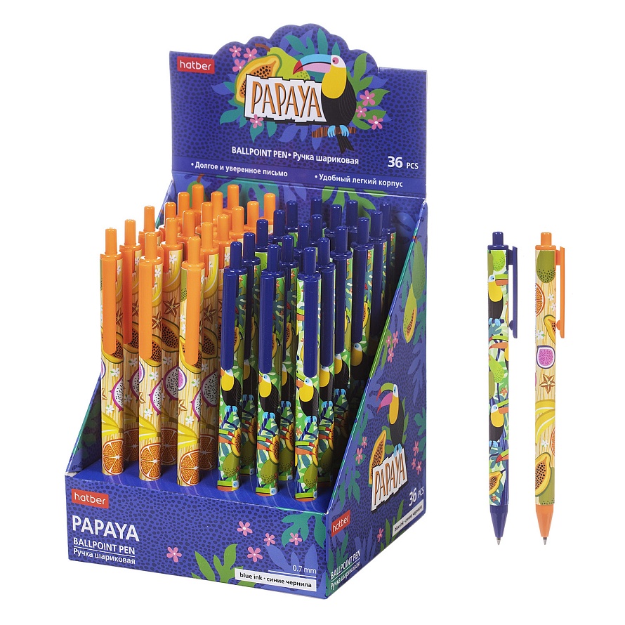 Шариковые автоматические ручки с эмоциональными современными патернами. Хорошая эргономика. Специальный пишущий узел и чернила на масляной основе обеспечивают долгое, легкое и стабильное письмо. Диаметр пишущего узла - 0,7 мм. Цвет чернил: синий. Упаковка - картонный дисплей 36 шт.