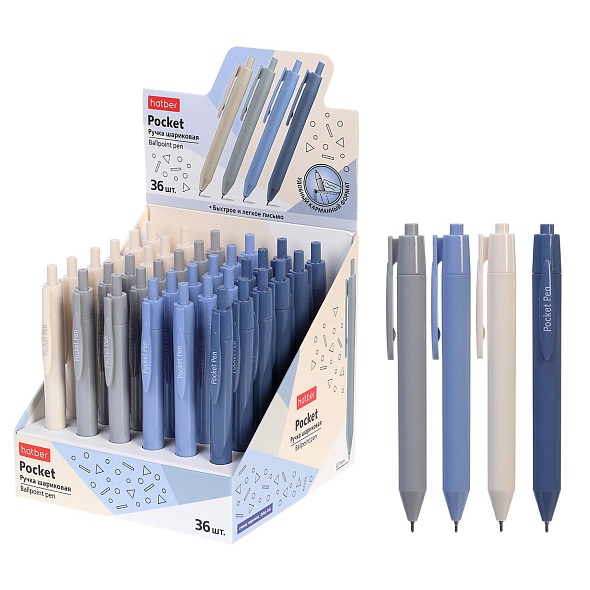 РУЧКА Hatber шариковая Pocket. Цвет чернил синий. Диаметр пишущего узла 0,7мм. 36 штук в картонном Мини-Дисплее