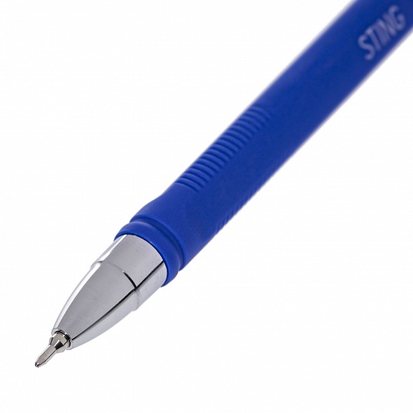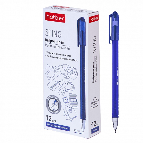 Ручка шариковая Sting с пониженной вязкостью чернил: для письма требуется меньшее давление на пишущую поверхность, благодаря этому кисть руки значительно меньше напрягается и устает. Пишущий узел с диаметром шарика 0,5 мм для особо тонкого письма. Удобный треугольный корпус с покрытием silk touch. Яркие водостойкие чернила. Подходит для быстрых заметок, набросков на бумаге любой плотности и качества, легко пишет на различных поверхностях, даже на стекле или загрязненной бумаге. Упаковка в картонную коробку по 12шт.
