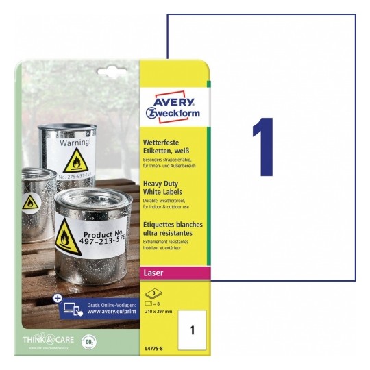 Прочные белые водостойкие этикетки из полиэстера размер 210х 297 мм, для печати на лазерных принтерах. 8 этикеток, 8листов. Благодаря сильному клеевому составу этикетки предназначены для надежной и прочной маркировки на улице или в складских помещениях. Они масло- и грязестойкие ,термостойкие, выдерживают перепады температур (от -20°C до +80°C) и водонепроницаемые. Идеальный вариант для инвентаризации в складских помещениях, маркировки коробок, ящиков, складских вещей. Благодаря бесплатному программному обеспечению и шаблонам Avery Zweckform Вам совсем не нужно тратить время на дизайн и печать этикеток и самоклеящейся бумаги А4. Мы предлагаем большой выбор дизайнов и готовых шаблонов для печати. Просто введите номер артикула с упаковки, выберите нужный дизайн, создайте свою этикетку и распечатайте! Готово!