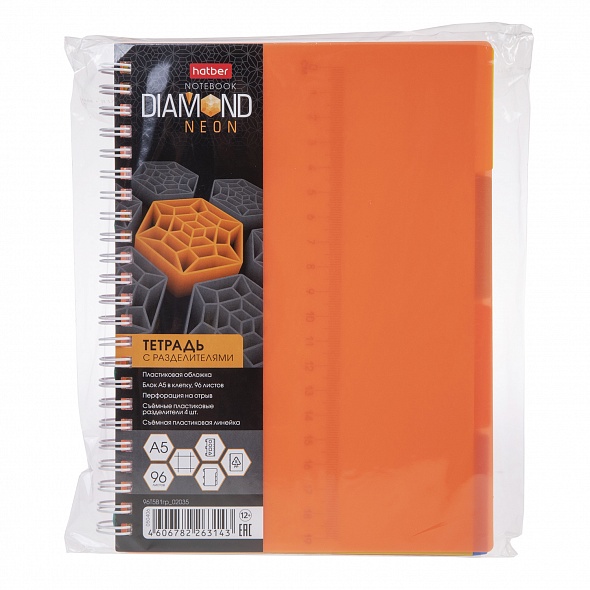 Тетрадь А5 формата (145х205 мм) 96 листов. Обложка: пластик, толщина 0,6 мм. Внутренний блок: офсет 60 гр., клетка, 4 цветных разделителя, с линейкой. Скрепление: гребень. Тетрадь предназначена для записей, подойдет для старшей школы, вуза, дома и офиса. Стильная рельефная неоновая пластиковая обложка имеет скругленные уголки. Тетрадь имеет 4 полупрозрачных цветных пластиковых разделителя с 'ушками', цепляющихся к гребню на замках. По такому же принципу к тетради крепится прозрачная пластиковая линейка, которая параллельно может служить и закладкой. Скрепление 'гребень' позволяет раскрывать тетрадь на 360 градусов. Тетради ТМ Hatber российского производства отпечатаны на современном высокотехнологичном оборудовании и соответствуют стандартам качества.