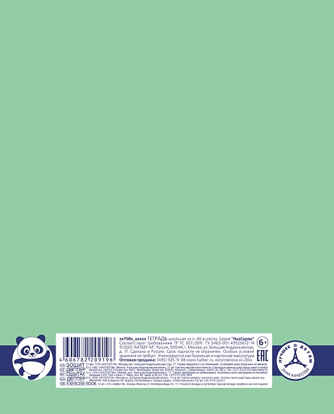 Тетрадь А5 формата 18 листов. Обложка- мелованный картон. Внутренний блок- офсет 80 гр., клетка, красные поля. Скрепление- скоба. Зеленые тетради классического дизайна, дополненные милым изображением панды, не оставят равнодушным ни одного школьника. Блок повышенной плотности и гладкости идеально подходит для всех видов пишущих принадлежностей, включая гелевые, капиллярные и перьевые ручки- написанное на одной стороне не просвечивает на другой. Внешний вид тетрадей надолго сохранит свою привлекательность за счет скругленных уголков. Внутренний блок с четко прорисованными полями и линовкой соответствуют высокому качеству полиграфии. Тетради упакованы в картонную транспортную коробку. На ней имеется перфорация для частичного отрыва верхней крышки, за счет которой коробка без особых усилий превращается в удобный шоу-бокс для выкладки тетрадей на полках магазинов.