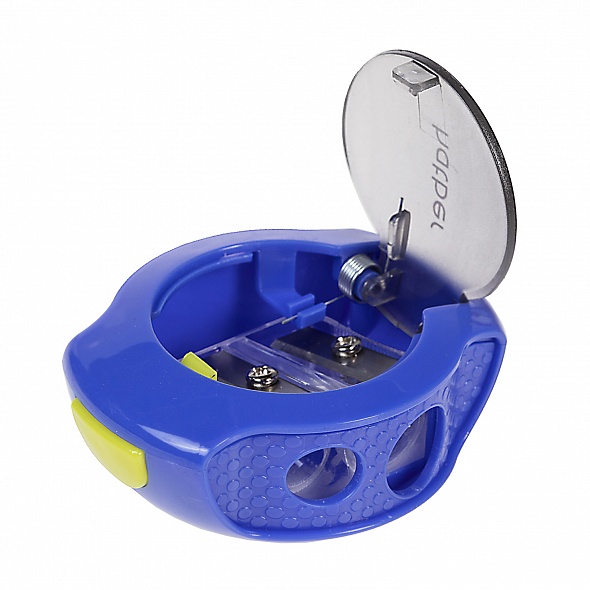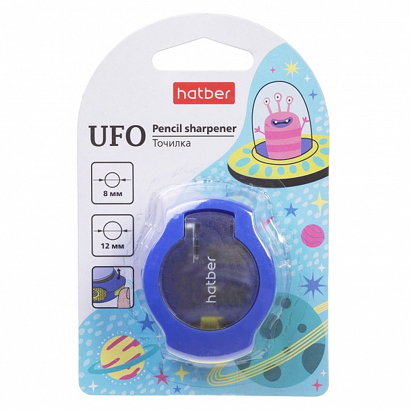 Детская точилка в форме летающей тарелки. Контейнер для стружки открывается нажатием на кнопку. Подходит для карандашей диаметром до 8 мм. Упаковка - блистер, блок 24 шт.