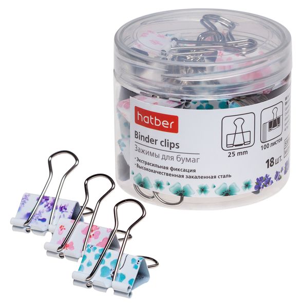 Эффектные и нарядные зажимы самого ходового размера 25 мм с изображением нежных цветов на белом фоне. Интересный и оригинальный аксессуар поможет создать хорошее настроение. Будет уместен не только при работе с документами, но и в качестве надежного замка для упаковок и пакетов. Зажимы предназначены для скрепления до 100 листов стандартной бумаги, не мнут документы, не оставляют следов, имеют удобные ушки. Изготовлены из улучшенной закаленной стали, не теряют своих пружинящих свойств даже после длительного использования. Надежно удерживают как один лист, так и стопку бумаг. Упаковка: 18 шт. в прочную прозрачную банку с завинчивающейся крышкой.