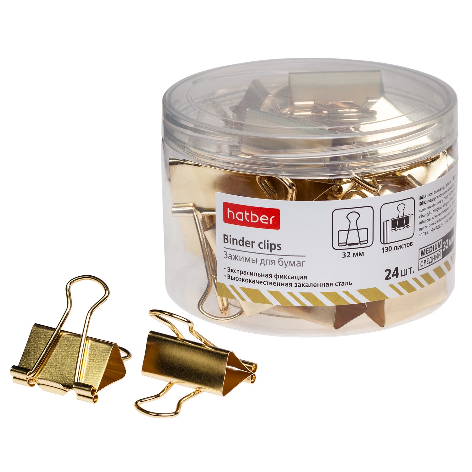 Зажимы 32 мм представлены в актуальном золотом цвете и предназначены для скрепления до 130 листов стандартной бумаги. Зажимы для бумаг не мнут документы, не оставляют следов, имеют удобные ушки. Изготовлены из улучшенной закаленной стали, не теряют своих пружинящих свойств даже после длительного использования. Надежно удерживают как один лист, так и стопку бумаг. Упаковка: 24 шт. в прочную прозрачную банку с завинчивающейся крышкой.